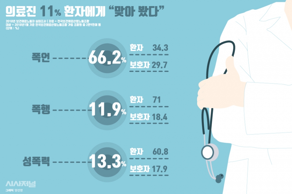 전국보건의료산업노동조합이 발표한 ‘2018 보건의료노동자 실태조사’에 따르면, 응답자 2만9000여 명 중에서 11.9%가 “폭행을 당한 적이 있다”고 응답했습니다. 그중에서 가해자는 환자 71%, 환자의 보호자 18.4%로 대부분을 차지했습니다. 이외에도 응답자들의 66.2%는 폭언을, 13.3%는 성폭력을 경험했다고 답했습니다.