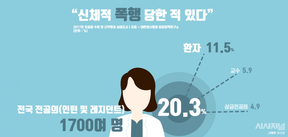 전공의의 경우도 다르지 않습니다. 대한의사협회 의료정책연구소가 지난해 발표한 ‘전공의 수련 및 근무환경 실태조사’에 따르면, 전국에서 근무하는 전공의(전문의가 되기 위해 수련하는 인턴 및 레지던트) 1700여 명 중 20.3%가 “신체적 폭행을 당한 적 있다”고 응답했습니다. 환자로부터 폭행당한 경우는 11.5%였습니다.