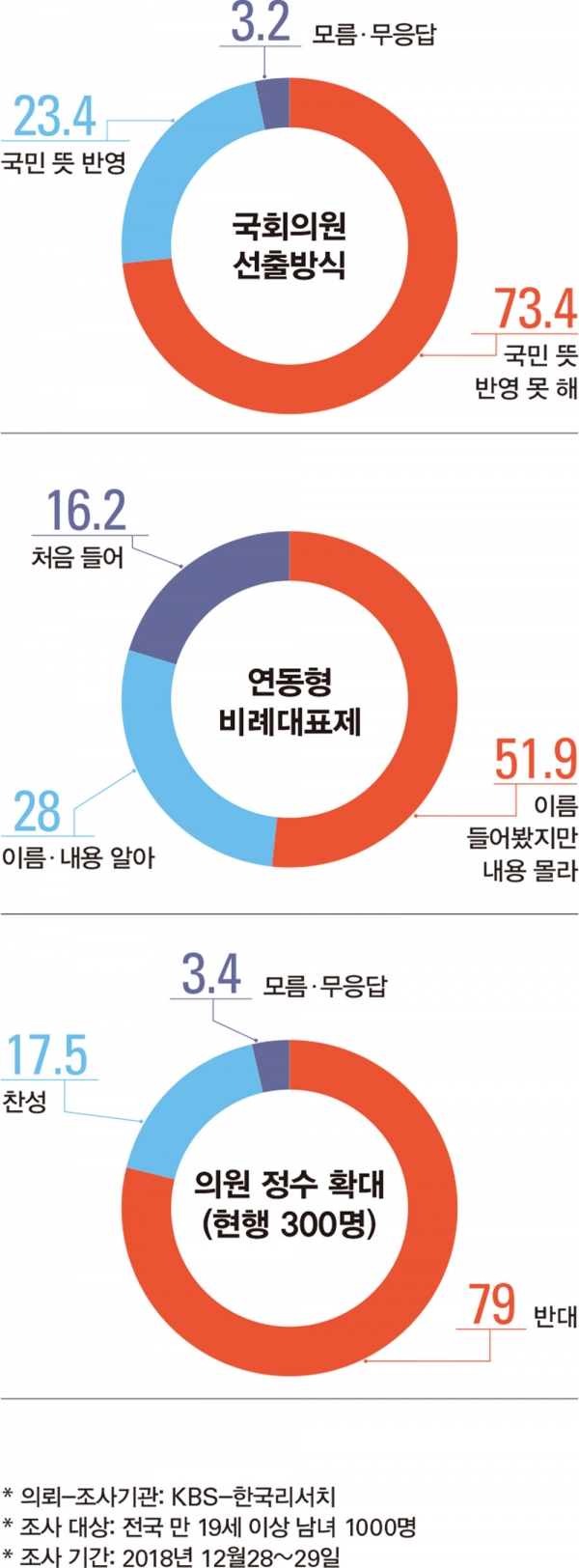 정작 국회에 대한 국민들의 불신이 선거제 개혁 논의의 발목을 잡고 있는 형국이다. 국민들이 특정 선거제를 선호하고 있지 않는 것으로 드러났다. 연동형 비례대표제 도입 여부에 대해선 찬성(46.4%)과 반대(44.1%)가 오차범위(2.3%포인트) 내에서 팽팽히 맞붙었다. 실제로 ‘연동형 비례대표제’의 이름을 알고 있다는 응답자는 79.9%에 달했지만, 이 제도의 내용까지 알고 있다고 답한 응답자는 28%에 불과했다.