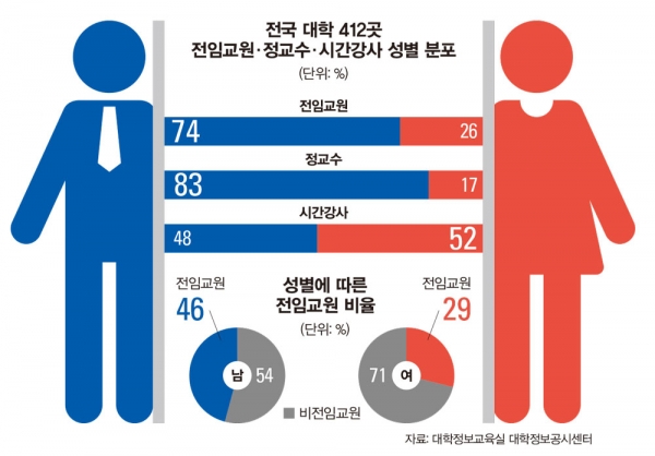 정교수 女 17% vs 男 83%…시간강사 女 52% vs 男 48%