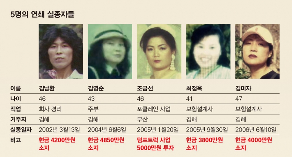 그런데 놀라운 사실이 새롭게 드러난다. 홍씨와 만난 뒤 사라진 것은 김미자씨만이 아니었다. 2002년부터 2006년까지 실종 여성이 4명이나 더 있었다. 거주지는 김해 4명, 부산 1명이었다.