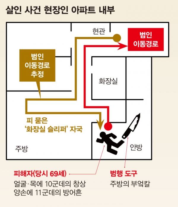 범인은 자신을 드러내지 않기 위해 심혈을 기울였다. 흔적을 남기지 않으려고 고심한 정황이 역력하다. 범행도구를 집 안에서 찾고 화장실 슬리퍼를 이용할 정도로 주도면밀했다. 피해자의 몸은 흉기에 찔려 많은 피를 흘렸다. 범인에게도 적지 않은 피가 튀었을 것이다. 범인의 옷에도 피가 흥건하게 묻어 있어야 한다. 범인이 화장실에서 피가 묻은 손 등을 씻었다고 해도 피 묻은 옷을 그대로 입고 나갔다면 그 흔적이 남아 있게 마련이다.