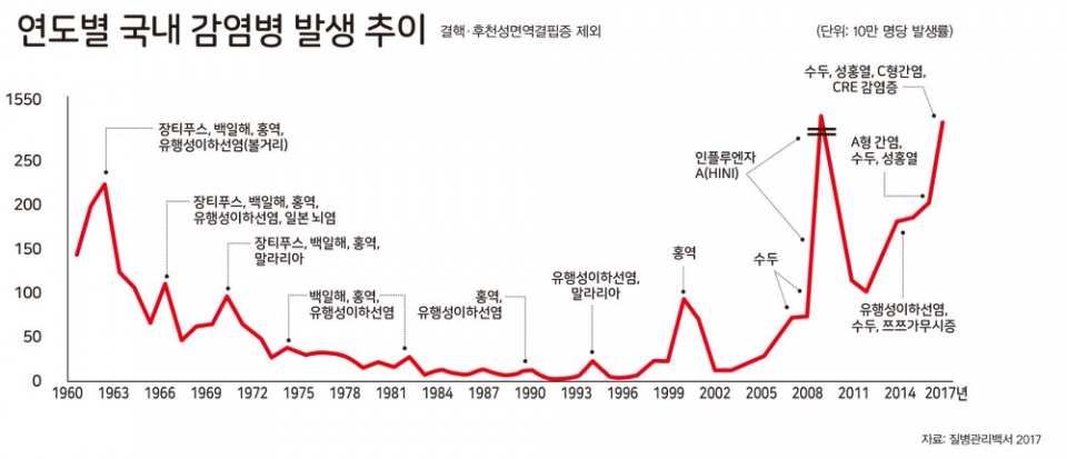 기온이 25도를 넘나들면서 감염병을 경계해야 할 시기가 왔다. 과거 전염병이라고 불렀던 감염병은 위생시설과 백신의 보급으로 1990년대까지 꾸준히 감소했다. 정부는 홍역 등 일부 질환에 대한 퇴치 선언도 했다. 그런데 감염병이 2000년대부터 증가세다. 급기야 위생 개념이 희박했던 1960년대보다 감염병 환자가 더 많아졌다. 질병관리본부가 매년 발간하는 ‘질병관리백서 2017’에 따르면, 1990년대 최저점을 찍은 감염병 발생은 점차 증가해 2017년 최고점을 찍었다. 1990년대 10만 명당 14.6명에서 2017년 295.5명으로 감염병 환자가 급증했다.