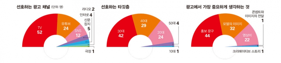 단순히 기업이 모델에 의존해 광고를 하던 시대가 지나간 것은 분명하다. ‘광고에서 가장 중요하게 생각하는 것이 무엇인가’라는 질문에 기업 100곳 중 44곳이 ‘광고 상품의 홍보 문구’를 1순위로 꼽았다. 모델의 이미지를 선택한 기업은 32곳이었다. 광고 상품을 홍보하는 영상미(22곳), 상품의 콘셉트와 이미지의 효과적인 전달(1곳), 크리에이티브 스토리(1곳) 순으로 그 뒤를 이었다.