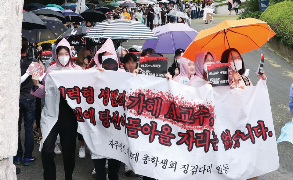 “A교수는 모든 잘못을 인정하고 사직하라.” 6월6일 현충일, 학생 700여 명이 서울 성북구 성신여대 돈암수정캠퍼스 앞에 모였다. 비가 내리는 공휴일, 학생들이 캠퍼스에 운집한 이유는 자신들을 지도했던 A교수의 파면을 촉구하기 위해서였다. A교수는 지난해 대학가 ‘미투 운동’ 당시 가해 교수로 지목됐던 인물이다. 총학생회에 따르면, 현대실용음악학과 소속 A교수는 지난해 4월 학생들과의 일대일 수업에서 “나이 차이가 많이 나는 어린 여자를 만나고 싶다” “너를 보니 전 여자친구가 생각난다” 등 성희롱 발언을 일삼은 것으로 전해졌다.