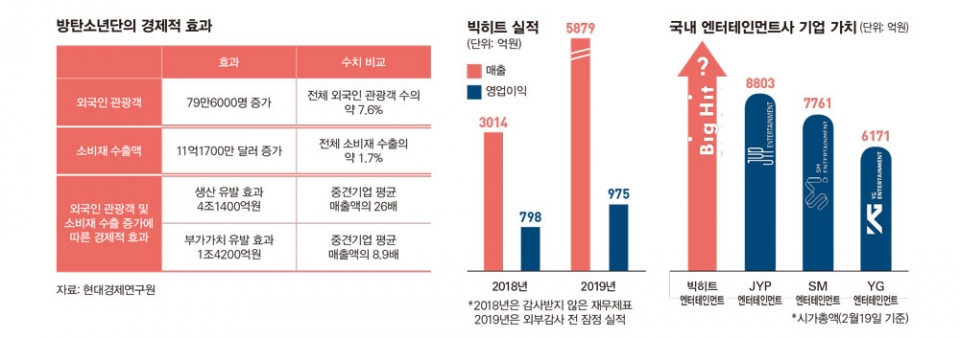 방탄소년단(BTS)이 만들어내는 경제효과는 그야말로 천문학적이다. 현대경제연구원은 2018년 내놓은 보고서 ‘BTS의 경제적 효과’에서 “방탄소년단의 생산 유발 효과는 연평균 4조1400억원, 부가가치 유발 효과는 연평균 1조4200억원으로 추정된다”고 밝혔다. BTS가 만들어내는 경제효과가 연간 5조5000억원이 훌쩍 넘는 것이다.