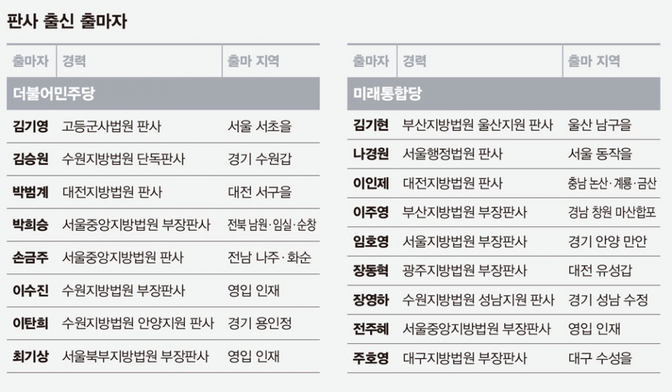 판사 출신 후보자는 민주당 8명, 통합당 9명인 것으로 나타났다. 여당은 이번 총선에서 사법농단에 저항했던 판사들을 전진 배치했다. 이탄희·이수진·최기상 전 판사가 바로 그들이다. 이 중 사법농단 의혹을 최초로 알린 이탄희 전 판사는 경기 용인정에 전략공천됐다. 그러나 최근 사법농단 연루자들이 잇따라 무죄를 선고받으면서 이들의 입지도 흔들리고 있다. 야당에서는 “문재인 정부가 존재하지도 않는 사건을 무리하게 끌고 왔고, 하명수사를 맡은 검찰이 무리하게 기소한 것”이라고 공격하고 있다.
