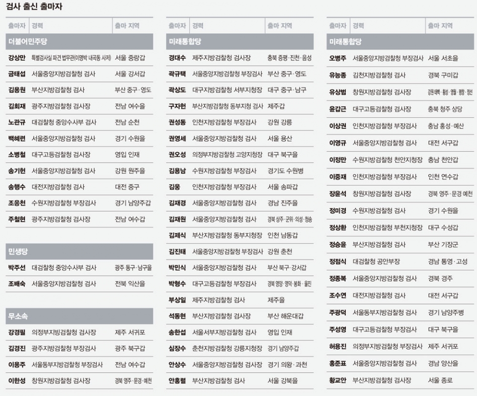 검사 출신 후보자의 경우, 여당인 더불어민주당이 11명인 반면 자유한국당과 새로운보수당이 합쳐진 미래통합당은 42명으로 4배가량 많았다. 이 밖에 바른미래당·대안신당·민주평화당 3당 합당으로 탄생한 민생당은 2명, 무소속은 4명이다.