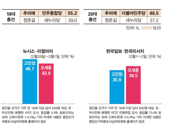 광진을 3월2일 더불어민주당의 고민정 전 청와대 대변인 측은 술렁였다. 전날 실시한 뉴시스·리얼미터 서울 광진을 국회의원 후보 가상대결 여론조사 결과 미래통합당의 오세훈 전 서울시장(42.0%)을 오차범위지만 4.1%포인트 앞서며 46.1%를 기록한 것이다. 바로 다음 날인 3일, 이번에는 오 전 시장 측이 환호했다. 한국일보·한국리서치 조사 결과 오 전 시장이 38.5%로 고 전 대변인(35.9%)에게 역시 오차범위 내에서 앞선 것이다. 그러나 오 전 시장의 들뜬 분위기도 오래가지 못했다. 바로 그다음 날인 4일, 광진구 선관위는 선거구민 등에게 설·추석 명절을 맞아 금품을 제공한 혐의로 오 전 시장을 2일 서울동부지검에 고발했다고 밝혔다. 오 전 시장은 “제가 사는 아파트에서 고생하시는 경비원분들에게 조그만 성의를 보여드린 것인데, 아무튼 선거를 앞두고 좀 더 신중하게 행동하지 못한 점은 반성한다”고 급히 해명에 나섰다.
