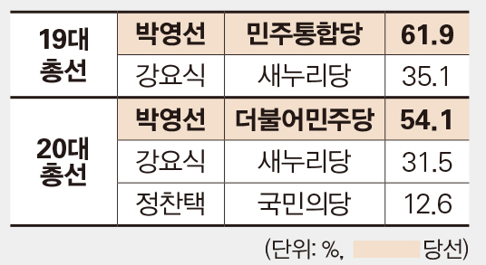 이 지역엔 국회 사무총장을 지낸 더불어민주당 김성곤 전 의원이 지난 1월 도전장을 던지고 지역 민심을 닦아왔다. 호남 4선 의원 출신인 김 전 의원은 앞선 20대 총선에서 험지인 강남갑에 도전해 45.2%의 높은 득표율로 이종구 통합당 의원에게 석패한 바 있다. 통합당이 이곳에 태 전 공사를 출마시켰다는 건, 반드시 그를 21대 국회에 진입시키겠다는 강한 의지라는 분석이다. 한반도 비핵화와 평화 국면을 강조해 온 문재인 정부의 대북정책을 제대로 견제하려는 의도인 셈이다.