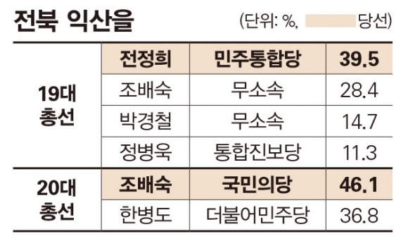 익산을은 전북에서 대표적으로 ‘당심’과 ‘인물’ 간 대결 구도가 형성돼 있다. 조 의원은 이곳에서 17, 18대 총선 승리를 거둔 후 19대에서 전정희 당시 민주통합당 후보와 붙어 고배를 마셨다. 그리고 20대에 다시 국회에 입성해 호남 유일의 3선 여성 중진 의원 입지를 다졌다. 그가 21대 국회 입성에 성공할 시, 대한민국 최초 여성 국회부의장에 오를 가능성도 높게 점쳐진다. 때마침 지역에서도 ‘중진 의원을 양성해야 한다’는 여론이 적잖이 형성돼 있다. 20대 총선에서 세대교체론이 대세였다면, 21대에서는 중진 등판론에 무게가 실리고 있다는 관측도 나온다.