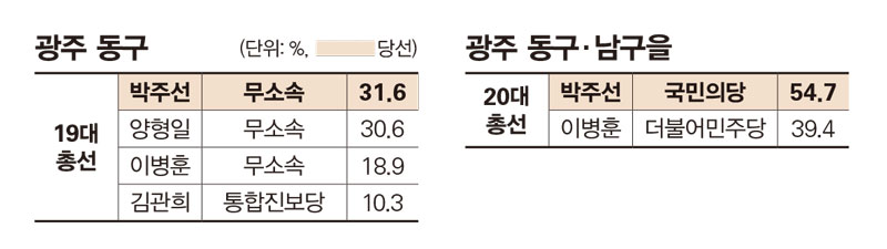 호남을 기반으로 한 야당에서 그나마 써볼 수 있는 카드는 ‘인물’이다. 호남 정치판에서 잔뼈가 굵은 박주선·천정배·김동철·장병완 의원 등의 이름이 대표적으로 거론된다. 이 중 박주선 민생당 의원이 ‘절대 맹주’로 군림하고 있는 광주 동구·남구을은 호남의 정치 1번지로 꼽힌다. 4선의 박 의원은 이 지역에서만 내리 3선을 지낼 정도로 조직력과 인지도가 높다. 20대 국회 전반기 부의장을 지냈고, 바른미래당 공동대표와 민생당 창당을 위한 3당 통합추진위원장 등 중량감 있는 정치 행보로 지역을 대표하는 정치인으로 보폭을 넓혀왔다. 정치 인생에 유종의 미를 거두겠다며 5선 도전에 나서고 있지만, 혁신과 변화를 요구하는 지역 민심을 어떻게 뛰어넘느냐는 주요한 과제다.