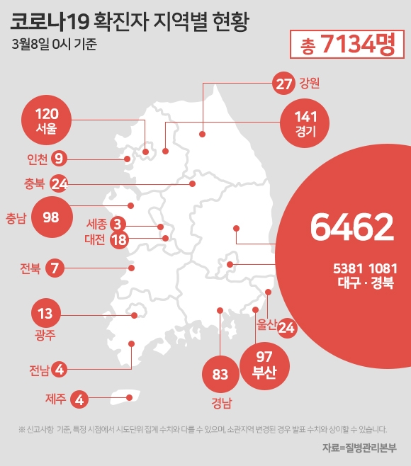 추가 확진자는 대구 지역에 집중돼 있다. 7일 하루 동안 추가된 확진자 367명 가운데 297명의 확진자가 대구 지역에 몰려 있다. 이로써 대구 지역 확진자는 5381명에 달했다. 경북 지역에서도 이날까지 1081명이 확진 판정을 받았다. 전체 확진자 7134명 가운데 6462명(90.6%)가 TK 지역에 몰려 있는 셈이다.
