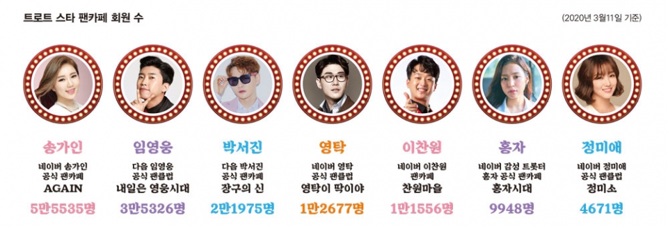 일약 슈퍼스타로 떠오른 송가인(35), 홍자(36), 임영웅, 박서진(26), 영탁(38), 이찬원(25) 등 트로트 가수들은 현재 팬카페 회원 수가 적게는 1만여 명에서 많게는 5만5000여 명에 이른다. 장윤정(1만여 명), 홍진영(7200여 명), 남진(3800여 명), 박현빈(2600여 명) 등 기존 톱스타들을 압도하는 수치다. 팬카페 회원 수를 인기의 척도로 내세울 순 없어도 신흥 스타들이 엄청난 팬덤을 보유했다는 사실은 분명하다.