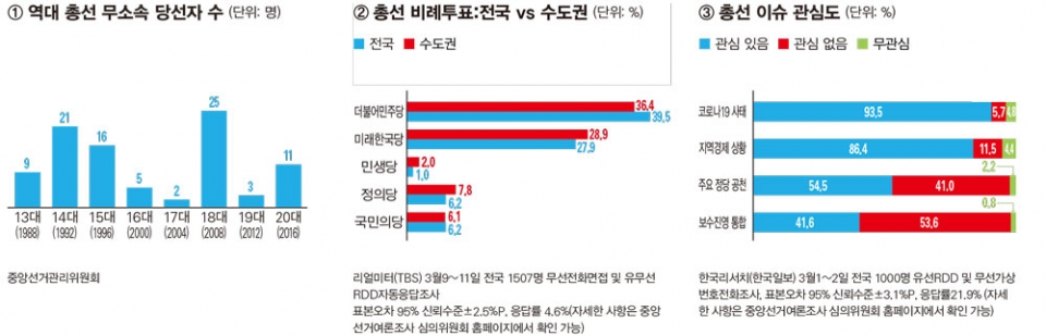 마지막으로 무소속 출마 파괴력이 제한적인 이유는 ‘총선 관심도’ 때문이다. 선거는 구도, 이슈, 후보로 구성된다. 구도는 철저하게 진영 간 대결구도다. 선거일이 가까워질수록 민주당과 통합당 중심으로 지지층이 더 집결하고 있다. 후보는 코로나19 국면 때문에 누가 출마했는지 잘 알기도 어렵고, 사실상 선거운동은 깜깜이다. 남은 것은 각 당의 총선 공약, 즉 이슈 차별화가 이루어져야 하는데 코로나19 블랙홀이 모든 이슈를 집어삼킨 지 이미 오래다. 한국리서치가 한국일보의 의뢰를 받아 3월1~2일 실시한 조사(자세한 개요는 그래프에 표시)에서 주요 이슈에 대한 총선 관심도를 물어보았다. 코로나19에 대해 10명 중 9명 이상이 관심을 가지고 있는 것으로 나타났다(그림③). 절대적인 관심이다. 그다음은 먹고사는 문제인 경제 이슈였다. 선거의 중심에 있어야 할 각 당의 공천이나 보수 통합 이슈는 상대적으로 관심권 밖으로 멀어졌다. 공천에서 무엇이 문제였고 무소속 출마 배경이 뭔지를 알고 있어야 하는데 그렇지 못하다. 무소속 후보에 대한 관심은 매우 제한적이다.