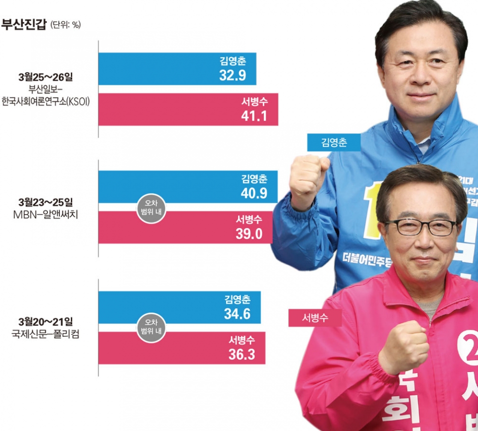 최근 여론조사를 보면 김 후보와 서 후보는 팽팽한 접전 양상을 보이고 있다. 3월20~21일 국제신문이 실시한 여론조사 결과를 보면 김 후보가 34.6%, 서 후보가 36.3%의 지지율을 받아 오차범위 내 경합을 벌였다. 이후 매일경제와 MBN이 3월23일부터 25일까지 실시한 여론조사 역시 김 후보의 지지율은 40.9%, 서 후보의 지지율은 39.0%로 조사돼 오차범위 안에서 경합했다.