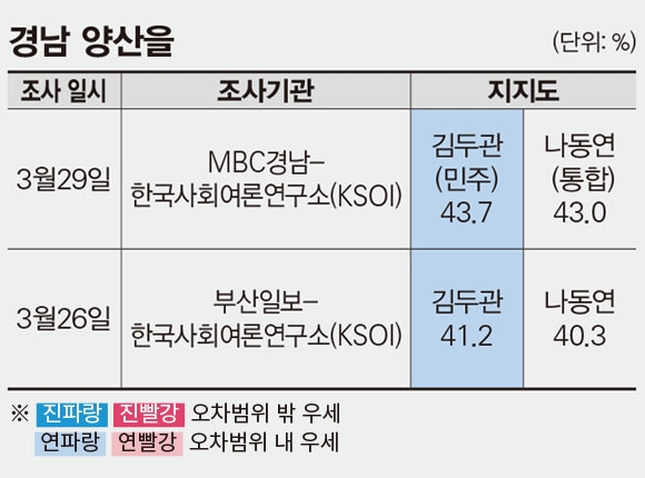 최근 판세만 놓고 보면 살얼음판 같은 승부가 이어지고 있다. 부산일보가 3월26일 진행한 여론조사에서 ‘4·15 총선에서 어떤 후보를 지지하는가’를 묻는 질문에 김 후보가 41.2%, 나 후보가 40.3%로 오차범위 내 초접전을 벌이고 있는 것으로 나타났다. MBC경남이 지난 3월29일 실시한 여론조사 결과 김 후보 43.7%, 나 후보 43.0%로 역시 오차범위 내 경합을 벌였다.