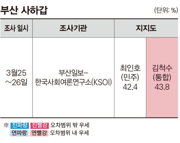 부산일보가 3월25~26일 실시한 여론조사에 따르면 ‘누구를 지지하겠느냐’는 질문에 김 후보를 택한 응답은 43.8%로 나타났다. 최 후보를 지지한다는 응답도 42.4%로 나타나면서 두 후보는 오차범위 안에서 접전 양상을 보였다.