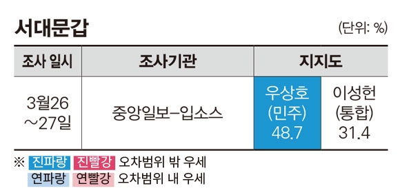 서대문갑▶ 무려 6번째 맞대결을 펼치는 서대문갑 지역의 우상호 후보(민주당)와 이성헌 후보(통합당)의 싸움에서는 일단 현역 의원인 우 후보가 17.3%p 차로 우세를 보이고 있다. 지난 5차례의 대결에서도 우 후보가 3승2패로 우위를 보였다. 지역 재개발로 아파트단지가 늘어나면서 30대와 40대층이 늘어났다는 점이 여론조사에서 우 후보의 지지율이 높게 나타나는 이유로 분석된다.