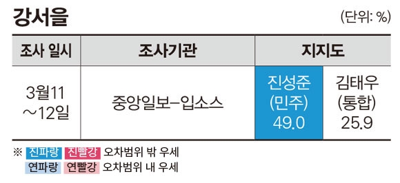 강서을▶강서을은 문재인 정부의 ‘청와대’ 출신과 ‘저격수’ 간 맞대결로 흥미를 끌고 있다. 두 사람은 청와대에서 함께 근무했던 동료이기도 했다. 2014년부터 강서을 지역위원장을 맡으며 열심히 표밭을 다져온 진성준 민주당 후보에 비해 김태우 통합당 후보는 뒤늦게 지역에 뛰어든 약점을 안고 있다.