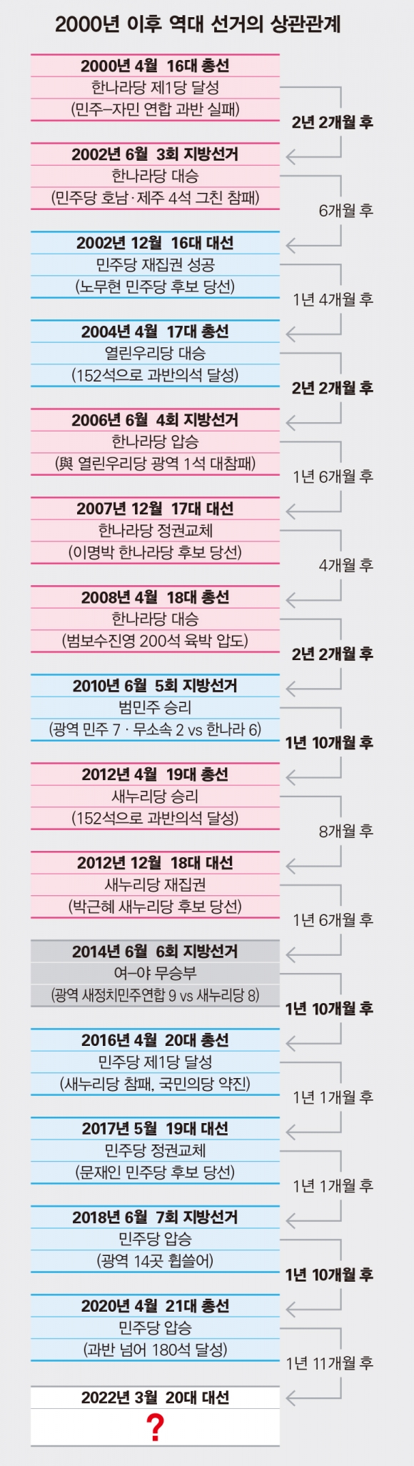 실제 당시 제1 야당이던 한나라당(미래통합당의 전신)이 2000년 4월 총선과 2002년 6월 지방선거에서 잇따라 승리하며 기세를 올렸지만, 막상 6개월 후에 벌어진 16대 대선에서는 노무현 민주당 후보에게 패하며 정권 탈환에 실패했다. 민주당 역시 2002년 12월 대선 승리에 이어 2004년 4월 총선에서도 열린우리당(민주당의 전신)이 152석으로 과반의석을 달성하는 대승을 거뒀지만, 2006년 6월 지방선거에서 대참패를 당한 이후 이듬해 12월 대선마저 패하면서 정권을 보수진영에 내줘야 했다.