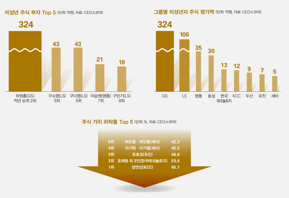 눈에 띄는 사실은 상위권과 하위권의 주식 평가액이 극명하게 엇갈리고 있다는 점이다. 상위 7명의 자산이 477억1000만원으로 나머지 22명의 자산 합계(83억원)보다 7배 이상 높았다. 미성년자 주식 부자 1위는 허용수 GS에너지 사장의 차남인 정홍군(16)이다. 올해 4월 정홍군의 주식 가치는 324억1000만원으로 나머지 28명의 자산을 합한 것보다 높게 나타났다.