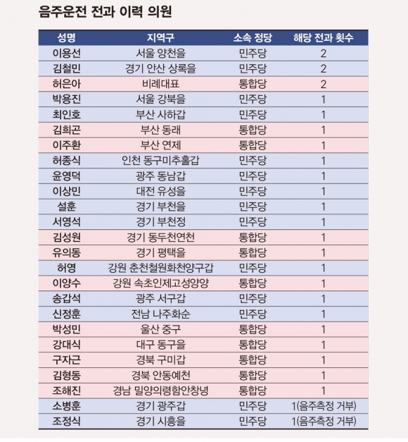 서울 양천을 이용선 의원은 총 3건의 전과 이력 중 2건이 음주운전으로 인한 도로교통법 위반이다. 이 의원은 두 차례의 법 위반으로 각각 벌금 100만원, 150만원을 냈다. 민주당 설훈·소병훈 의원은 똑같이 교통사고처리특례법과 도로교통법을 위반한 이력을 갖고 있다. 설 의원은 음주운전, 소 의원은 음주측정 거부가 처벌 이유였다.