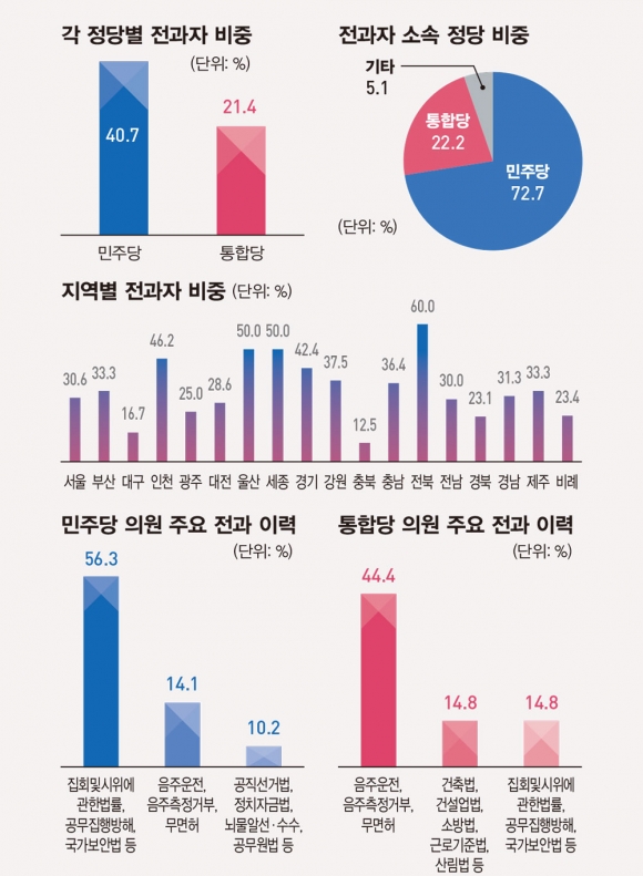 민주당 의원 중에는 국가보안법 위반 등 민주화운동과 관련된 전과 이력이 가장 많았다. 과거 군사정권 시절 재야·학생운동을 벌이는 과정에서 집회 및 시위에 관한 법률(집시법)이나 폭력행위 등 처벌에 관한 법률(폭력처벌법)을 위반한 경우가 대다수를 차지했다. 분명 현행법을 위반한 것은 맞지만 진보진영 내에선 이를 명예로운 훈장으로 여기기도 한다. 민주당 의원 전과 기록 전체 128건 중 가장 많은 유형은 집시법 및 국보법 위반 등으로 총 72건(56.3%)이었다. 그 뒤를 음주운전(14.1%), 정치자금법 위반(10.2%) 등이 이었다.