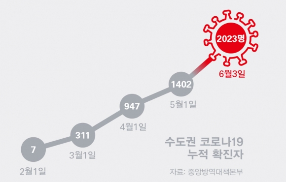 3월11일 서울 구로 콜센터 집단감염으로 3월초 300명 수준이던 수도권 감염자가 3월말 900명대로 뛰었다. 그 시기를 수도권의 코로나19 1차 피크라고 할 수 있다. 김우주 고대구로병원 감염내과 교수는 “4월 다소 잠잠하다가 5월 서울 이태원 클럽과 쿠팡 물류센터 집단감염 등으로 수도권 코로나19 2차 피크가 시작됐다. 이런 시각에서 방역체계를 다시 들여다봐야 한다”고 강조했다.