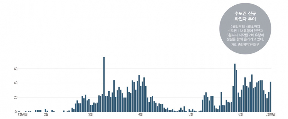수도권에서는 이미 2차 유행이 시작됐으며 아직 정점을 찍지도 않았다는 의료계의 분석이 나왔다. 여름은 조용히 지나가고 가을쯤 코로나19 2차 유행이 닥칠 것이라는 기존 예측을 앞지르는 확산세다. 김우주 고대구로병원 감염내과 교수는 “신규 확진자가 10명 미만이던 4월처럼 5월도 사회적 거리 두기를 더 유지했다면 지역사회 발생이 없는 뉴질랜드나 대만과 같은 모델로 갈 수 있었다. 그러나 5월6일 생활방역으로 전환하면서 결국 사달이 났다. 수도권의 신규 확진자 추이를 보면, 2월말부터 4월초까지 1차 유행이 있었고 5월부터 이미 2차 유행이 시작됐다. 현재는 정점을 향해 올라가고 있다. 그나마 여름이라는 계절적 요인 때문에 이 정도지, 만일 겨울이었다면 폭발적으로 확산했을 것”이라고 설명했다.