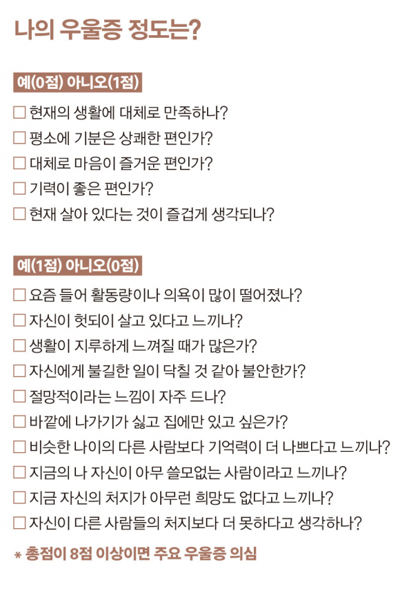 “건강하게 마음 다스리기는 매사에 긍정적인 마음가짐을 갖고 우울 증상이나 외로움 등 심리적 어려움이 있다면 전문가의 도움을 받으라는 권고다. 긍정적인 정서는 노쇠 발생 위험을 8% 줄여준다. 우울 증상이 많아지면 노쇠 발생 위험이 커지고 심하면 그 위험이 2.2배까지 증가한다. 매사에 흥미가 없고 무관심하거나 외로움을 심하게 느끼면 노쇠 발생 위험이 각각 2.9배와 1.9배 증가한다. 이와 같은 노년기의 심리적 어려움은 전문가를 통해 관리해야 한다.”