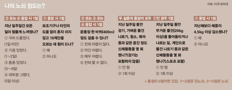 노화와 노쇠는 다르다. 노화가 나이를 먹으면서 생기는 다양한 현상이라면 노쇠는 몸이 약해 장애가 생길 위험에 처한 상태를 의미한다. 평소 생활 속에서도 노쇠를 의심할 만한 증상을 짚어볼 수 있다. 이윤환 아주대의대 예방의학교실 교수는 “한국 노인 노쇠 코호트 연구에 이용하는 노쇠 표현형 항목 다섯 가지를 살펴보면 노화 정도를 알 수 있다”고 설명했다.