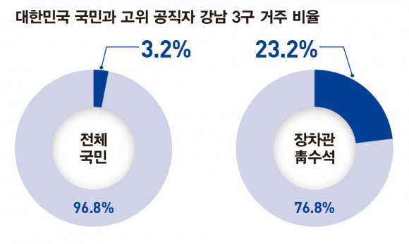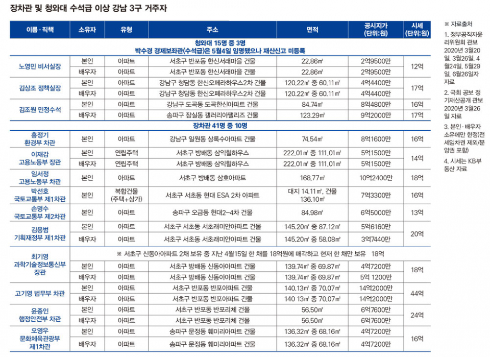 문재인 정부 18개 부처 장차관 41명 중 10명이 강남 3구에 부동산을 소유, 거주하고 있었다. 최기영 과학기술정보통신부 장관과 이재갑 고용노동부 장관 등 장관 2명과 홍정기 환경부 차관, 임서정 고용노동부 차관, 박선호 국토교통부 제1차관, 김용범 기획재정부 제1차관 등 차관 8명이다.