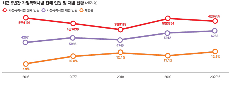 가정폭력 피해자들은 가정을 회복할 수 있다는 기대나 가해자의 보복이 두려워 처벌불원 의사를 밝힌다. 그러나 오히려 이런 행동은 가정폭력의 재범 가능성을 높일 뿐이라는 지적이 나온다. 실제로 송기헌 더불어민주당 의원이 법무부로부터 제출받은 자료에 따르면, 가정폭력사범의 재범률은 2015년 4.7%에서 2020년 12.6%로 3배가량으로 폭증했다.