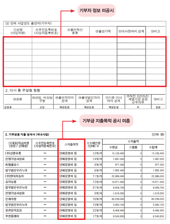 그 밖에 광복회는 기부자 정보를 빠뜨리는 실수를 했다. 관련법 시행규칙은 공익법인에 매년 2000만원 이상 기부한 개인 또는 법인의 정보를 공시하도록 규정하고 있다. 이는 기부자와의 특수관계를 검토하기 위해 만든 규칙이다. 이에 따라 특정 단체에 2000만원 넘게 기부한 변호사나 세무사는 해당 단체의 외부 전문가로 일할 수 없다.