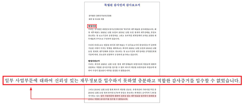 규모가 큰 만큼 외부 회계법인으로부터 매년 감사를 받고 있다. 그런데 뚜껑을 열어보니 제한적 평가를 받는 데 그치고 있었다. 2019~20년 감사보고서에 따르면, 상이군경회는 2년 연속 ‘한정의견’을 받았다. 가이드스타 관계자는 “감사 범위에 제한이 있지만 중대하지 않거나, 회계 기준 위배 사항이 있지만 부적정 판단을 내리기 힘들 때 한정의견을 제시한다”고 설명했다. 구체적으로 감사보고서에는 “일부 사업에 대해 신뢰성 있는 재무 정보를 입수하지 못하여 충분하고 적합한 감사 증거를 입수할 수 없었다”는 지적이 나와 있었다. 투명한 감사에 필요한 근거 자료를 제공하지 않았다는 뜻이다.
