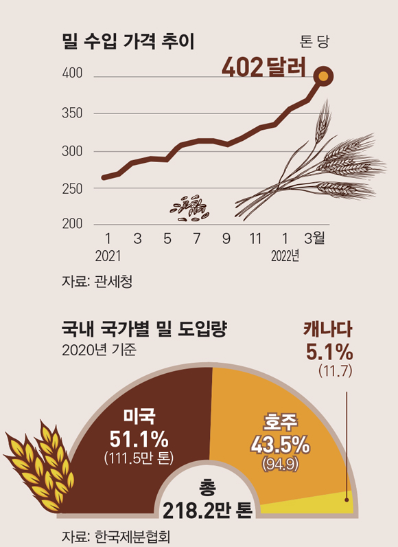 관세청과 식품업계에 따르면 올해 3월 기준 밀 수입량은 42만9000톤, 수입액은 1억7245만 달러로 톤당 가격이 402달러에 달했다. 2008년 12월(406달러) 이후 13년3개월 만에 최고 기록이다. 1년 전 같은 달과 비교하면 41.4%, 코로나19 사태 초기인 2020년 3월보다는 54.3% 각각 상승했다. 러시아의 우크라이나 침공 사태와 글로벌 물류난이 지속되는 탓이다.