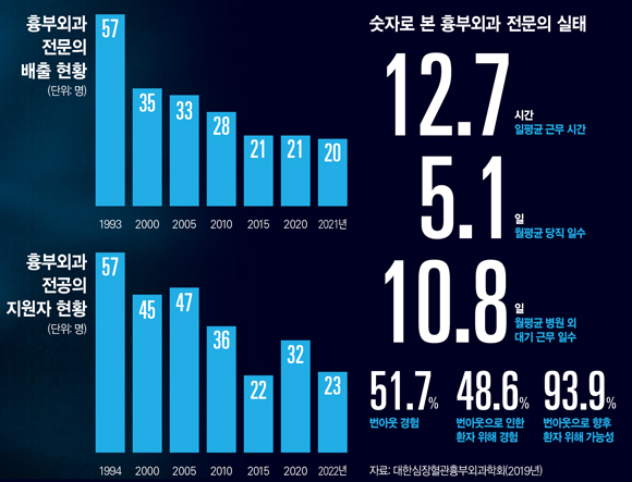대한전공의협의회가 2018년 공개한 전공의 평균 연봉은 약 4000만원이다. 이보다 두 배를 준다고 해도 흉부외과 전공의 지원자는 거의 없다시피 한 실정이다. 2022년 주요 대학병원의 흉부외과 지원 현황을 보면, 서울아산병원은 정원 4명 가운데 지원자는 3명이었고, 가톨릭병원도 정원 5명 중 지원자는 1명이었다. 삼성서울병원은 정원 4명 중 지원자가 1명이었으며, 세브란스병원은 정원 4명에 1명의 지원자도 없었다. 서울대병원은 정원 4명에 지원자 4명으로 겨우 미달 사태를 피했다. 흉부외과학회에 따르면 1~4년 차 전공의가 모두 있는 대학병원은 전국에서 5개 병원(서울대병원·삼성서울병원·서울아산병원·전남대병원·부산대병원)뿐이다.