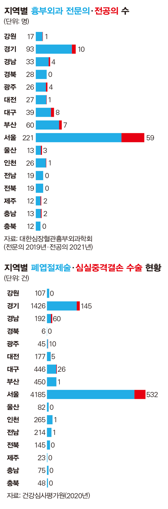 지방 병원의 흉부외과 현실은 더 참혹하다. 시쳇말로 전공의 씨가 말랐다. 흉부외과학회가 2021년 조사한 바에 따르면, 전국에서 활동 중인 전공의 102명 중 약 70%에 해당하는 69명이 서울과 경기도에 몰려 있다. 비수도권 가운데 흉부외과 전공의가 가장 많다는 대구도 8명으로, 10명이 안 된다. 경북·전남·전북·충북에는 흉부외과 전공의가 1명도 없다.