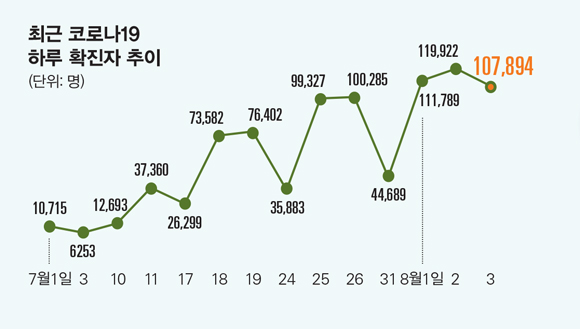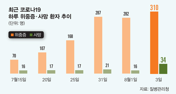 또 중증화율과 치명률이 낮더라도 확진자 수가 급증하면 피해가 늘어날 수밖에 없다. 7월3일 6253명이던 하루 확진자는 약 1개월 만인 8월2일 11만9922명으로 급증했다. 이에 따라 위중증 환자와 사망자도 증가하는 추세다. 8월3일 하루 위중증 환자는 310명으로 5월말 이후 약 2개월 만에 최고치를 기록했다. 입원환자 수도 7월2일 65명에서 8월3일 479명으로 7배 이상 증가했고, 사망자도 하루 20~30명씩 발생한다.