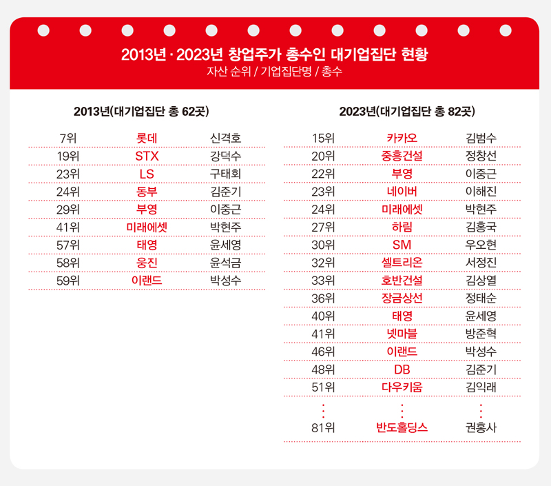 82개 대기업집단 중 동일인(총수)이 있는 기업은 포스코, 농협, KT, HMM, S-Oil, KT&G, 대우조선해양, 쿠팡, 한국항공우주산업, 한국GM을 제외한 72곳이다. 김범석 쿠팡Inc 이사회 의장이 미국 국적이란 이유로 총수 지정을 피한 점을 고려하면 오너가 있는 대기업은 사실상 73곳인 셈이다. 공정위 지정에 포함된 72곳 가운데 창업자가 총수인 대기업집단은 28곳(38.8%)으로 나타났다. 2013년(43곳 중 9곳·20.9%)과 비교하면 20%포인트가량 증가했다.