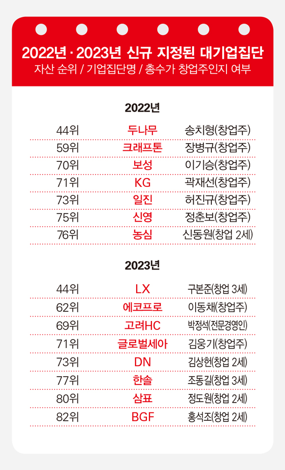 창업자가 총수인 10년 전 대기업의 면면을 보면 롯데(신격호), STX(강덕수), LS(구태회), 동부(DB의 전신·김준기), 부영(이중근), 미래에셋(박현주), 태영(윤세영), 웅진(윤석금), 이랜드(박성수) 등 전통 산업군에 속한 곳이 주를 이뤘다. 공정위 관계자는 올해 대기업집단 지정의 가장 두드러진 특징에 대해 “전기차 등 신(新)산업이 발달하면서 대기업집단 수가 지난해보다 8개 증가했고, 비대면 시장 활성화와 해운 운임 상승으로 온라인유통·해운 업종 주력 집단들의 자산 순위가 상승했다”며 “기업집단 간 결합과 엔터테인먼트 산업의 성장도 대기업집단 지정에 영향을 미쳤다”고 설명했다. 산업 재편이 활발히 이뤄졌다는 말이다. 이에 따라 창업주로서 새로이 대기업 총수 반열에 오른 이도 2명(이동채 에코프로 회장, 김웅기 글로벌세아 회장) 생겼다. 이들 기업은 전년 대비 자산총액이 2조원 이상 급증했다.