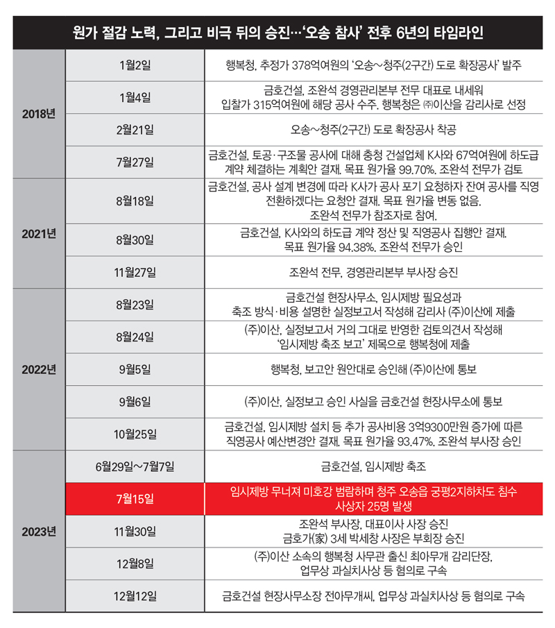지난 여름 25명의 사상자가 발생한 ‘오송 참사’와 관련해 부실 공사와 책임 면피의 정황을 보여주는 새로운 증거가 발견됐다. 참사 원인으로 지목된 임시제방의 공사를 맡은 금호건설과 감리사, 행정중심복합도시건설청(행복청)이 작성한 문건을 시사저널이 단독 입수했다. 해당 문건에는 임시제방의 축조 방식과 비용, 결재 라인 등이 담겨 있다. 여기에는 금호건설이 원가 절감을 위해 저렴한 축조 방식을 선택했고, 참사 후 승진한 신임 사장이 임시제방 설치안을 최종 결재했으며, 감리사는 침수 위험을 알고도 수정 없이 설치안을 통과시킨 사실이 고스란히 나와 있다.