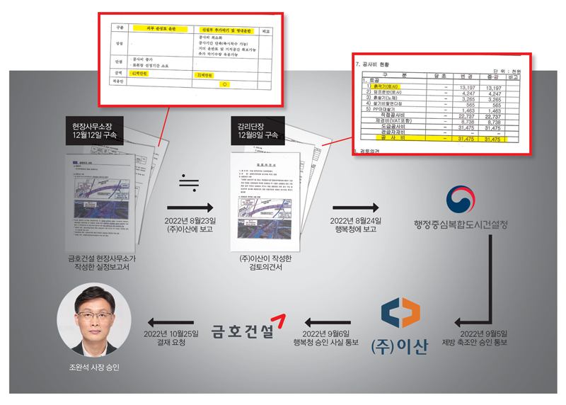 금호건설은 이 같은 내용을 담은 실정보고서를 도로 확장공사의 현장 감리사(책임건설사업관리기술자)인 (주)이산에 2022년 8월23일 제출했다. 다음 날 이산은 실정보고서를 거의 그대로 반영한 문건에 “임시제방 축조는 타당하다고 판단됨”이란 검토 의견을 덧붙여 행복청에 ‘임시제방 축조 보고’란 제목으로 올렸다. 2022년 9월5일 행복청은 보고안을 원안대로 승인해 다시 이산에 넘겼고, 다음 날 이산은 금호건설에 이를 전달했다. 문제의 임시제방이 이런 식으로 건설된 것이다.