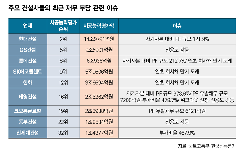 각각 시공능력평가 순위 2위와 8위인 현대건설과 롯데건설도 자기자본 대비 부동산 PF 규모가 커 안심할 수 없는 처지다. 2023년 9월말 기준 자기자본 대비 부동산 PF 규모는 태영건설이 373.6%로 주요 건설사 중 가장 컸고 롯데건설(212.7%), 현대건설(121.9%) 역시 세 자릿수를 기록하며 뒤를 이었다. 롯데건설은 2022년 말 레고랜드 사태로 한 차례 유동성 위기를 겪기도 했다.