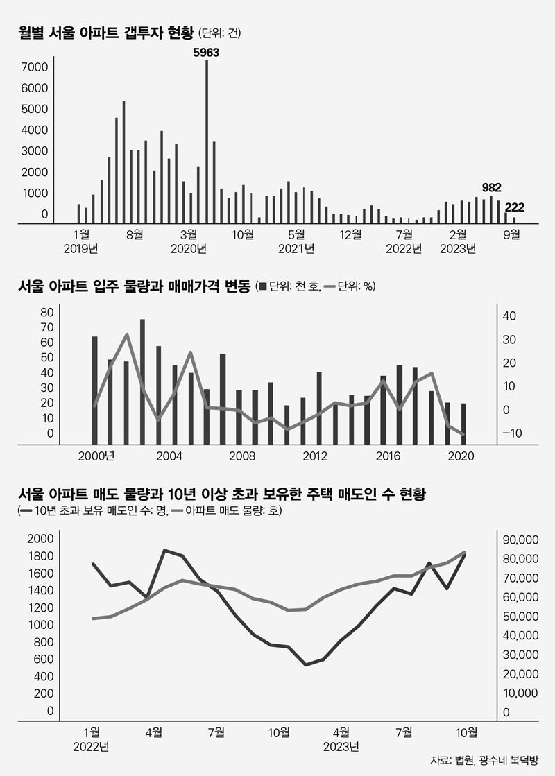 그렇다면 집값 변동을 일으키는 수요는 어떤 것일까. 2019년 이후 월별 갭투자를 살펴보면, 아파트 가격이 급등한 2020년 서울 아파트 갭투자 건수는 월평균 2059건에 달했다. 매월 거래된 서울 아파트 중에서 31%가 갭투자, 즉 투자 수요였다. 투자 수요가 급증하면서 아파트 가격이 상승했던 것이다. 최근 상황은 어떨까. 2023년 11월 기준 서울 아파트 갭투자 건수는 222건에 불과한 상황이다. 감소하던 투자 수요가 2023년 2월 이후 증가했으나 10월부터 다시 빠르게 감소하고 있다. 시장가격 변동을 일으키는 수요는 이 급변하는 투자 수요다. 따라서 부동산 시장을 전망하기 위해서는 투자 수요를 예측해야 한다.