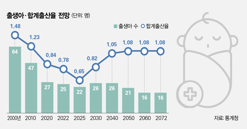 통계청은 ‘장래인구추계: 2022∼2072년’을 통해, 합계출산율(여성 1명이 평생 낳을 것으로 예상되는 평균 출생아 수)이 올해 0.68명을 기록하고, 내년에는 0.65명으로 최저점을 찍을 것으로 전망했다. 더 안 좋은 상황을 가정한 저위 시나리오에서는 2026년 출산율이 0.59명까지 떨어질 것으로 예상했다. 2022~72년까지 출산율 1.0을 밑도는 국가는 경제협력개발기구(OECD) 38개 회원국 중 우리나라가 유일하다.