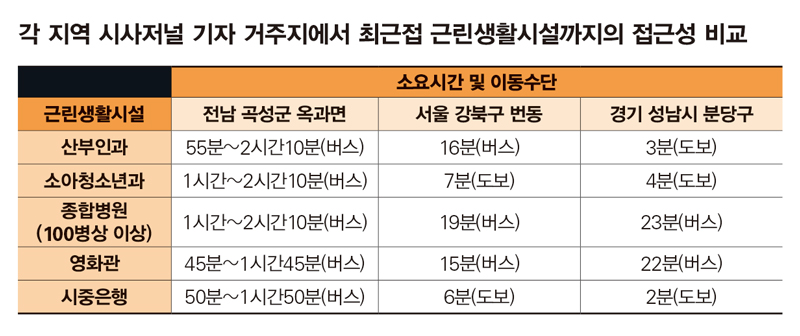 수도권은 근린생활시설 22곳 모두 도보 또는 버스로 최장 23분이면 접근이 가능했다. 시사저널이 서울 강북구 번동과 경기 성남시 분당구의 소속 기자 집에서 같은 시설을 대상으로 각각 소요시간을 잰 결과다. 특히 강북과 분당에는 곡성군에 한 곳도 없는 산부인과, 소아과, 종합병원이 다 있었다.