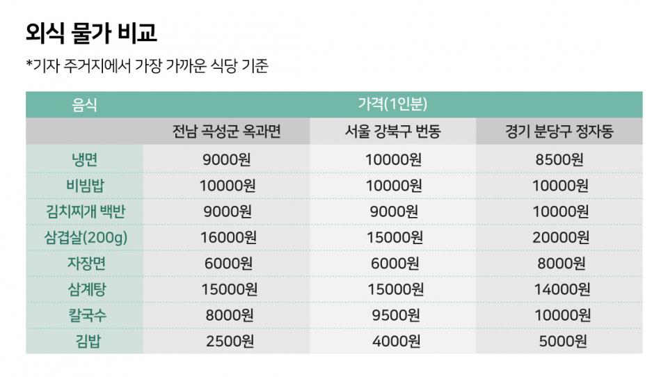 물가도 발목을 잡았다. 한국소비자원에서 외식비를 측정하는 8가지 품목의 가격을 거주지에서 가장 가까운 식당 기준으로 비교해 봤다. 김밥과 칼국수를 제외하면 옥과면 외식비는 강북·분당과 비슷한 수준이었다. 삼겹살과 삼계탕은 더 비싼 경우도 있었다. 옥과면의 여러 식당 점주들은 “물류비와 인건비 때문에 쉽게 가격을 낮추기 힘들다”고 입을 모아 말했다. 주거비도 만만치 않다. 보증금 500만원·전용 33㎡ 이하 원룸의 월세를 비교했을 때 옥과면은 25만~35만원 수준이고, 광주 번화가 상무지구는 18만~60만원이었다. 최저가는 광주가 더 저렴하다. 심재우 옥과면 청년회장은 “광주 시내 접근성이 좋다는 이유만으로 수요가 없는데도 집값이 비싸다”고 지적했다.