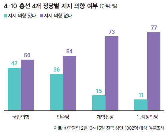 ‘151석’. 이재명 민주당 대표가 제시한 이번 총선의 목표 의석이다. 약 3주 전 이 수치가 제시될 때만 해도 당내 일각에서 ‘최대 180석’이란 자신감 넘치는 낙관론이 나돌 정도로 장밋빛 전망이 우세했다. ‘최대치 151석’을 목표로 삼은 배경엔 정권 심판론에 기대고 있는 당내 낙관주의를 각성시키려는 의도가 깔려있다는 분석까지 나왔다. 그러나 불과 2~3주 사이에 분위기가 확 바뀌었다. 2월13~15일 한국갤럽 여론조사에서 정당별 총선 지지 의향에 국민의힘 42%, 민주당 36%로 격차가 6%포인트로 벌어졌다. 1월 4주 차만 하더라도 국민의힘 39%, 민주당 40%로 여전히 민주당이 앞서는 분위기였으나 반전이 일어났다. 더 놀라운 건 ‘지지할 의향이 없다’는 응답이 1월 4주 차엔 국민의힘 55%, 민주당 52%였는데, 2주 만에 국민의힘 50%, 민주당 54%로 뒤바뀐 것이다.